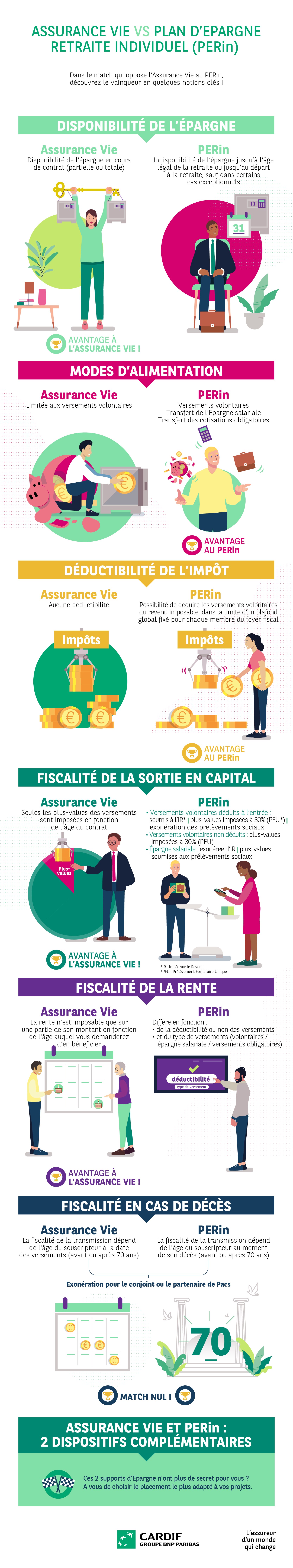 Le PERin permet des économies d’impôt car ses versements sont déductibles de leur revenu imposable. L’assurance vie bénéficie d’allègements fiscaux si votre contrat a plus de 8 ans.